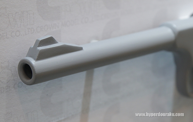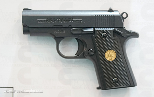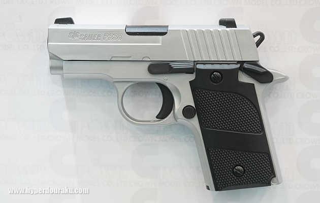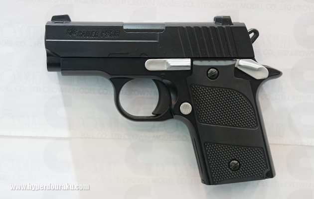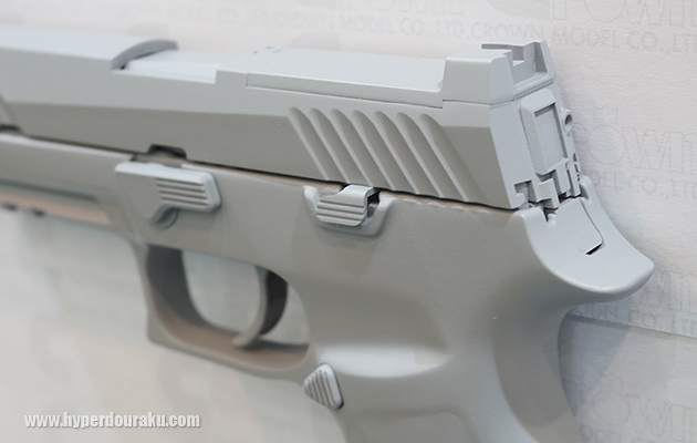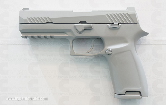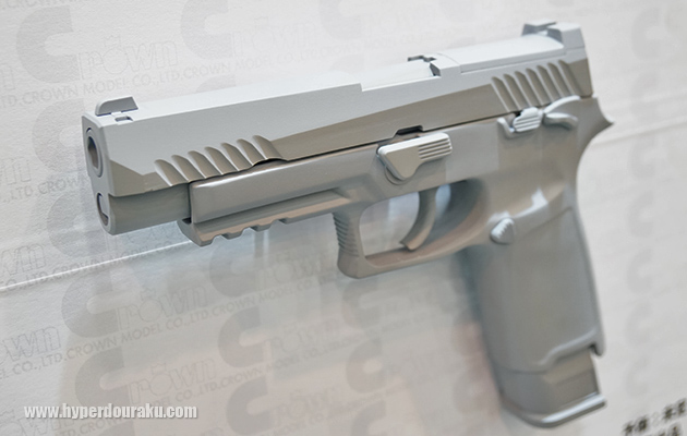 このモデル、SIG AIRのCO2ガスガンが国内ではすでに発売済みで、マルイもリキッドチャージ式のガスブローバックガンを発表済み。そこへクラウンがエアコキで三つ巴の様相。果たしてライセンスの問題はどうなるのか?