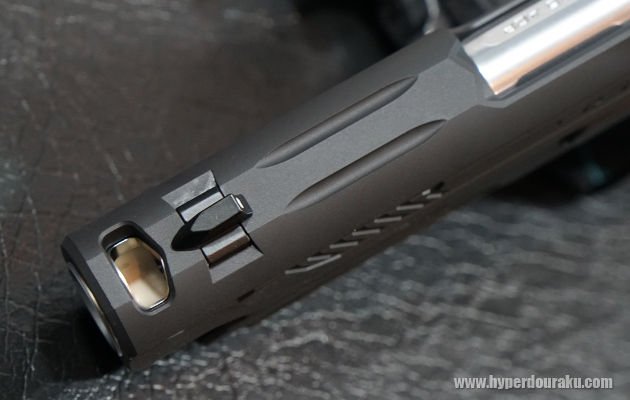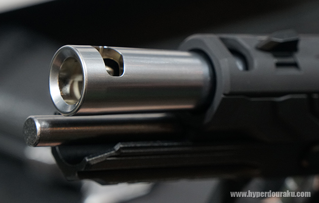アウターバレルにもポート穴が開いている。真鍮インナーバレルはダークグレーにメッキされている。