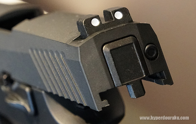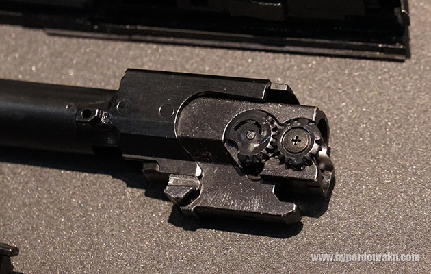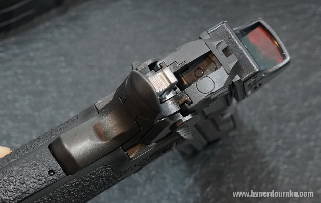 金属製のフロント、リアサイトはホワイトドットが入る。スライドリアキャップ、エキストラクター、エキストラクタープランジャーも金属製の別パーツ。設計担当スタッフさんと話ができたが、オプティックレディも検討しているとのことで、その際にはシリンダー形状をMOSのように変更するそうだ。
