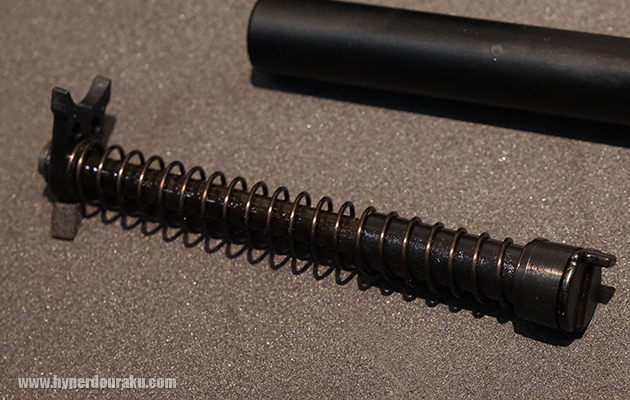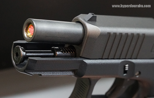スライド素材はG17 Gen5から採用されたカーボン繊維入り強化樹脂で、見た目にはかなり薄くつくられているが、十分な強度があるそう。レール付きのシリンダーブリーチ。φ15mmの大口径ピストン採用。