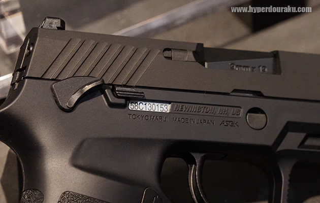 スライド左にはP320の刻印。アウターバレルのティルトアシスト機構を採用。実際にスライドを操作してみたが、G17 Gen5のように引っ掛かりのない、スムースな動きだった。また、テイクダウンレバーはマガジンが入っていると回転しない安全機構がある。