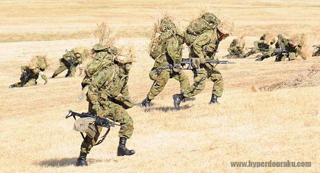 手前の隊員は5.56mm機関銃MINIMI、89式小銃折り曲げ銃床、後方には01式軽対戦車誘導弾を装備した隊員の姿も見える。