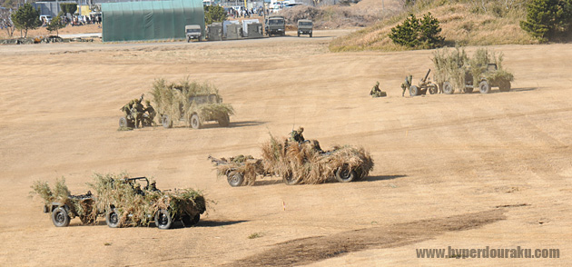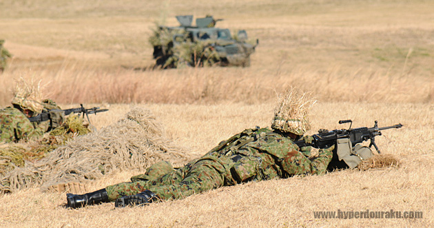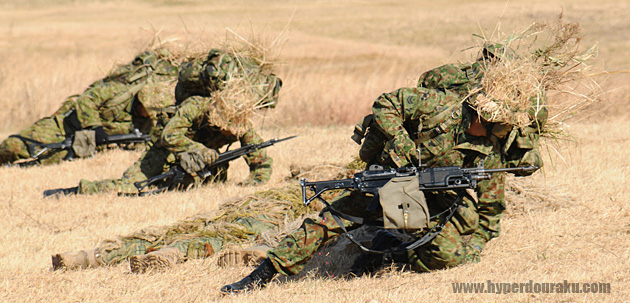 稜線際では姿勢を低くし、先行してしたスナイパーチームと合流、89式小銃折り曲げ銃床式や5.56mm機関銃MINIMIなどで敵を迎え撃つ。