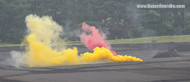 まずはグランド奥に赤と黄色のスモークが上がる。この地点をてきが占領している想定で進軍する。
