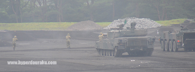 グランド右手には特科部隊の99式自走155mmりゅう弾砲、FH70、203mm自走りゅう弾砲が進入してくる。