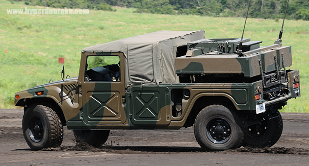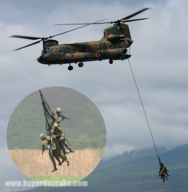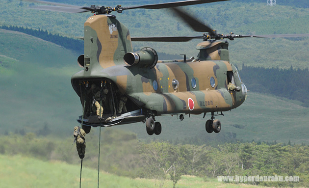 CH-47JAチヌーク輸送ヘリに吊下げられた軽装高機動車も運ばれてくる。