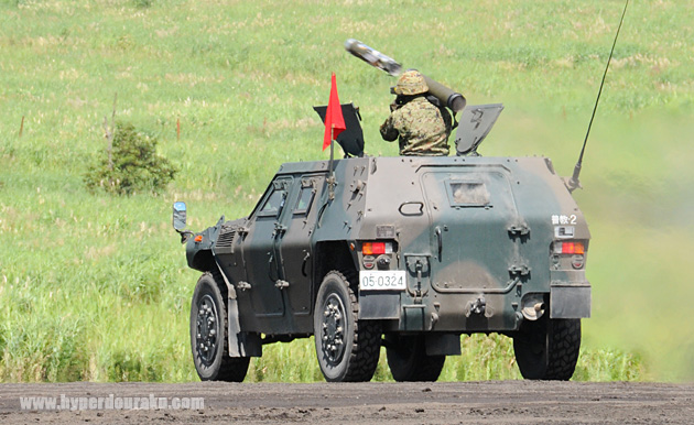軽装甲機動車のルーフから01式軽対戦車誘導弾(軽MAT)を射撃。まずは近距離目標に対して低伸弾道モードで射撃。この軽MATはバックブラストが少ないのが特徴。今年はダイブモードは発射せずに終わった。