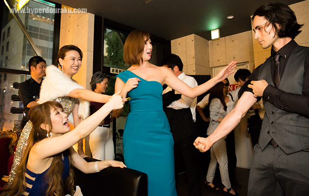 スパンコールのワンピースを着用。その青島さんをエスコートするのは、ホテルコンチネンタル オーナーに扮する東京マルイの島村さん。2人とも様になっていた。