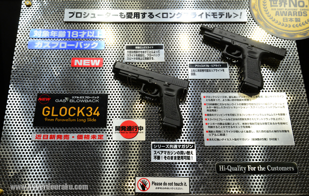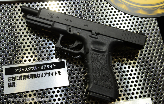グロック34。ガスブローバックガン。今回初めてのお披露目。ロングスライドを装備した9mmのコンペティションモデル。全長222mm、重量710g、装弾数は25発。