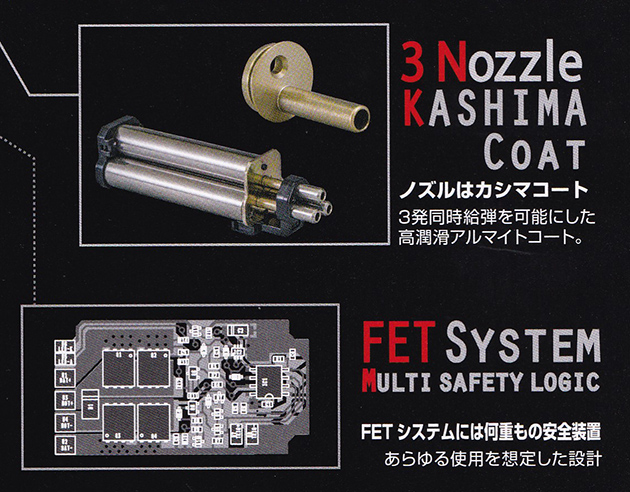 3シリンダー構造に、ノズル部には二硫化モリブデン配合・自己潤滑アルマイトの"カシマコート"を採用。マルイ初採用となる電子スイッチ、FETシステムには何重もの安全装置が組み込まれているようだ。また3発それぞれが調節可能な可変ホップアップシステムも搭載。