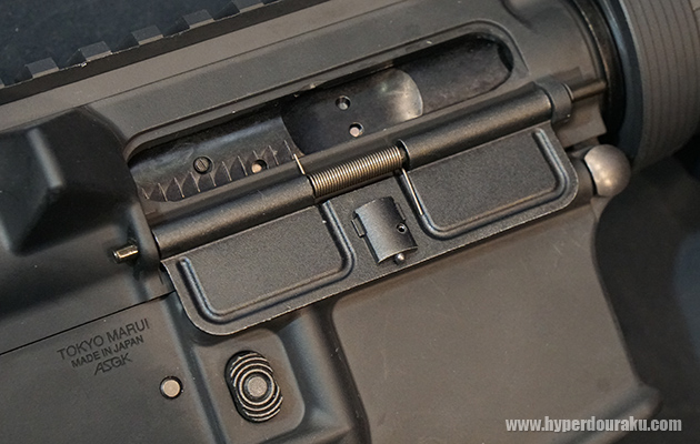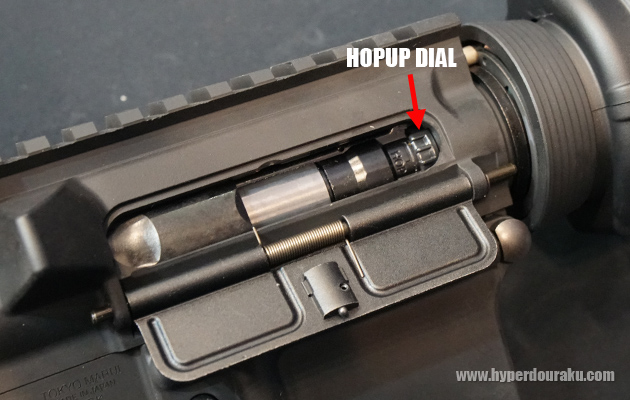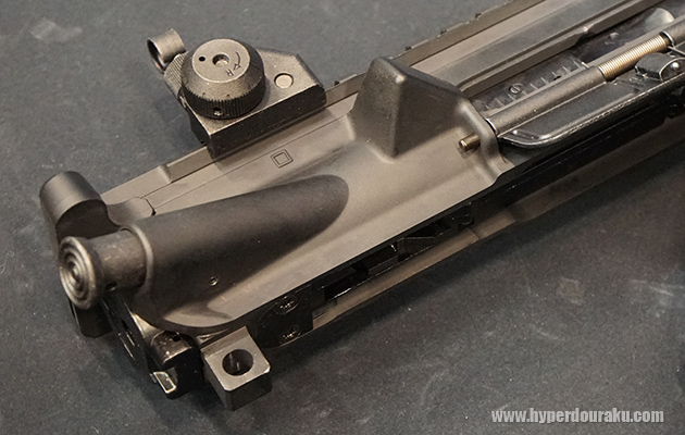 チャージングハンドルを引くか、ホールドオープンするとダミーボルトが写真の位置まで後退して停止する。可変ホップアップダイヤルは従来の位置にある。射撃時にはダミーボルトが前後し、電子制御されているので、中途半端な位置で止まってしまうこともなかった。