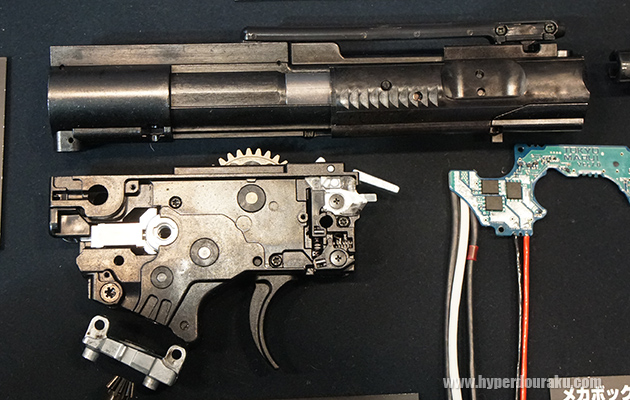 ギアボックス側面に取り付けられるMシステム/タイプIIの基盤。次世代電動ガンのMP5に搭載のMシステムから発展した電子制御システムで、マグネットセンサー6か所に加え、トリガーもカムを介したマイクロスイッチ式。