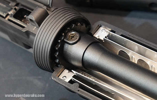 ギア配置はこのようになっている。ギア軸は従来の3mm径から4mm径に太くなって耐久性がアップしている。また設計上ではグリップ取り付け基部の角度を変更できるようにし、今後のバリエーション展開にも対応するそうだ。