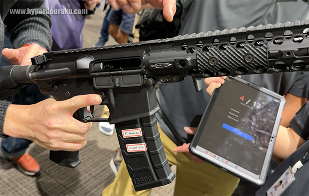 Bluetooth連動したトレーニング用マガジンにより、専用のタブレット端末で装填から射撃をした際の残弾表示から、トレーニングとしてわざとに弾詰まりを引き起こしてその対処の訓練などが体験できた。