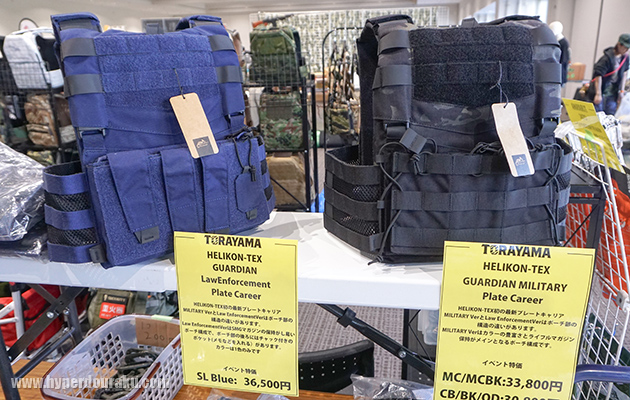 「ミリタリーショップTORAYAMA」では日本ではこの日に初公開となるHELIKON-TEXの最新プレートキャリア「GUARDIAN PLATE CAREER」を販売。手錠や9mm弾系統を使用する法執行機関向けにポーチが構成された「LAW ENFORCEMENT」と、ライフルマガジンの保持を目的とした「military」の2種類の展開だ。