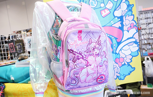 かわいい獣人たちと銃を掛け合わせたイラストを展開する「King's Melon Soda」では、ワッペンやシールの販売に新作としてプリントリュックサックを販売していた。