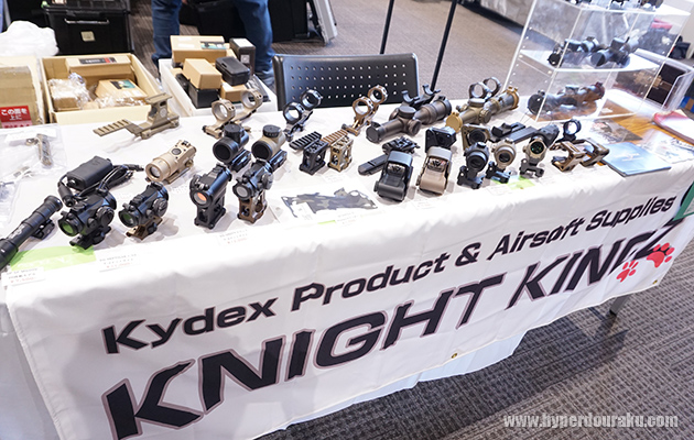 「KNIGHT KINGZ」はシューティングや狩猟用の実銃用光学機器として製造されている「SWAMP DEER OPTICS」の正規代理店で、各種光学機器が並んでいた。