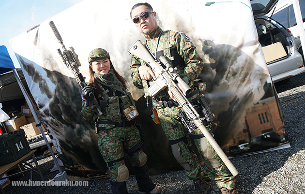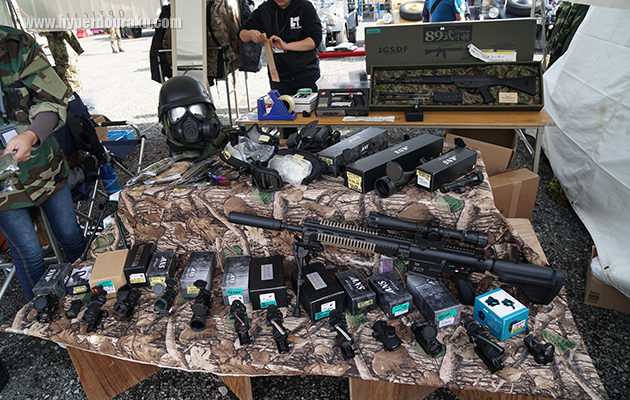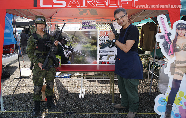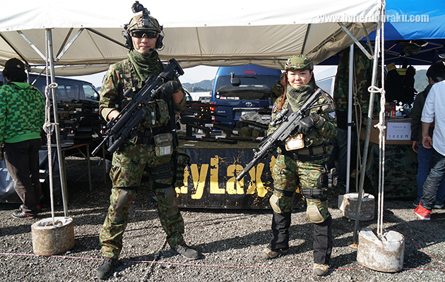 エアガンカスタムパーツのライラクス。広報のノムさん達は珍しく陸自迷彩のフル装備。手にするのはやはり89式小銃のカスタムガン、虎徹、雷切。