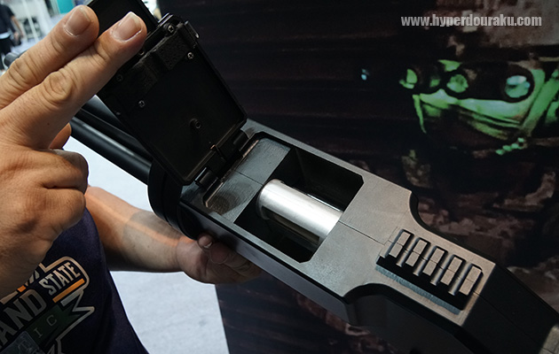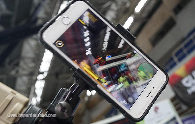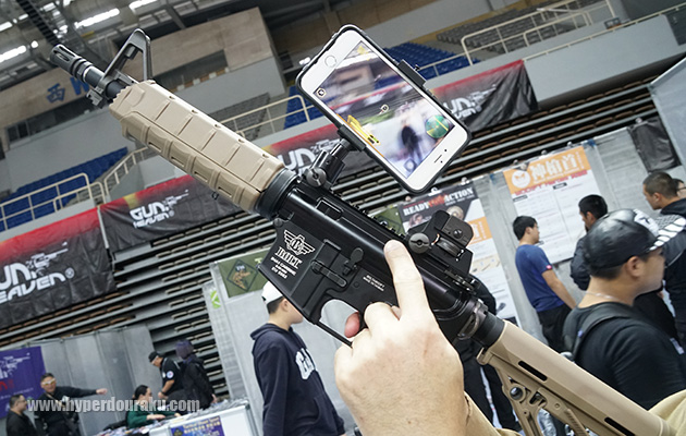 スマホアプリを使用したARシューティングゲームを展示していた。リコイルユニットとワイヤレスのトリガーユニットは別のバッテリーで駆動している。