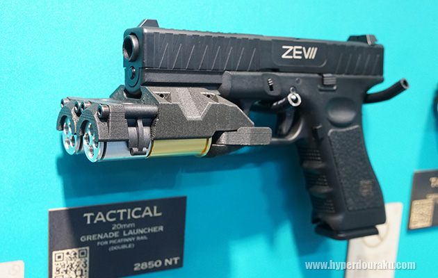 TACTICAL 20mmグレネードランチャー。ハンドガンにアンダーマウントするランチャー。左右のレバーがトリガーとなっている。
