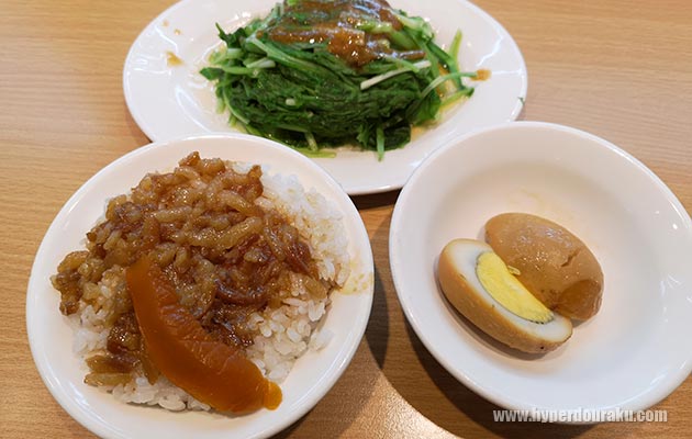 台湾のソウルフード、ルーローハン(魯肉飯)。そしてルーダン(煮卵)と炒め野菜も添えて食す!!