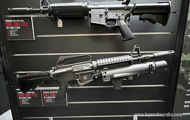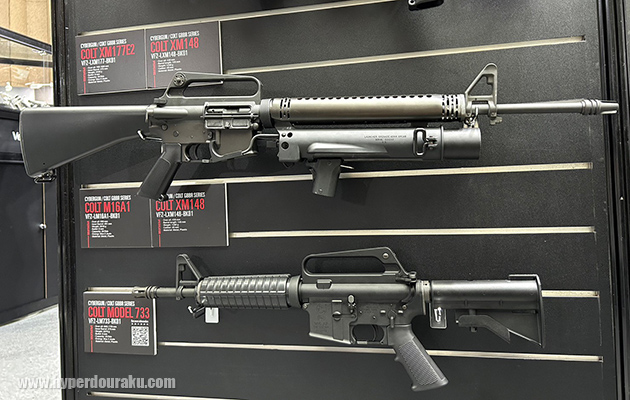コルト M16A1ガスブローバック + XM148 40mmガスグレネードランチャー、下はコルト M733ガスブローバック。