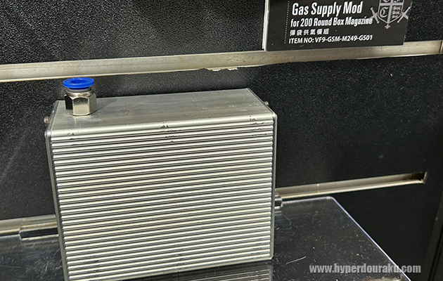 200連ボックスマガジン用リキッドチャージケース。写真は台湾のグリーンガス用だが、HFC134aにも使用できるとのこと。100連用、30連マガジンもある。
