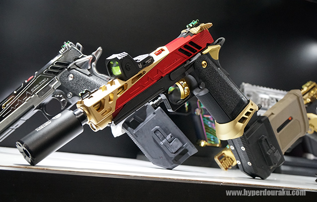 ハイキャパのカスタムもカッコいい。流行りのセパレートスライドにTDCホップ、HPA仕様のマガジンはM4用を水平にセットできる。