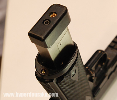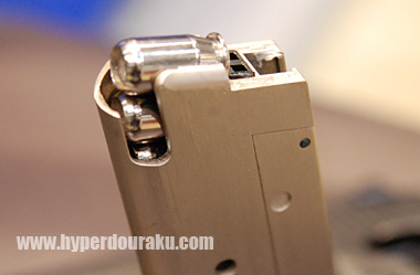 マガジンは先に発売されている排莢式ガスガンに似ている。前部分にカートリッジを装填し、ボトム部分からガスを注入。背面を通って上部のバルブへとガスが導かれる構造。