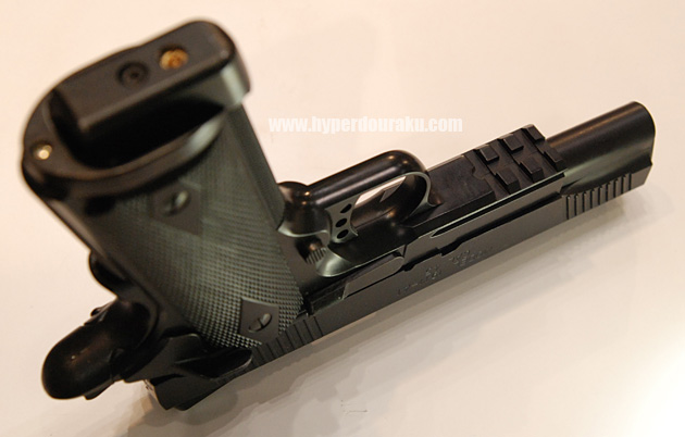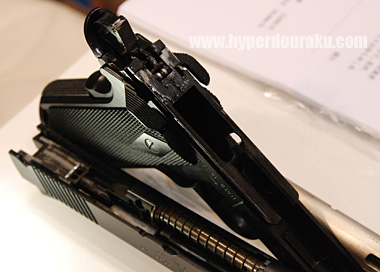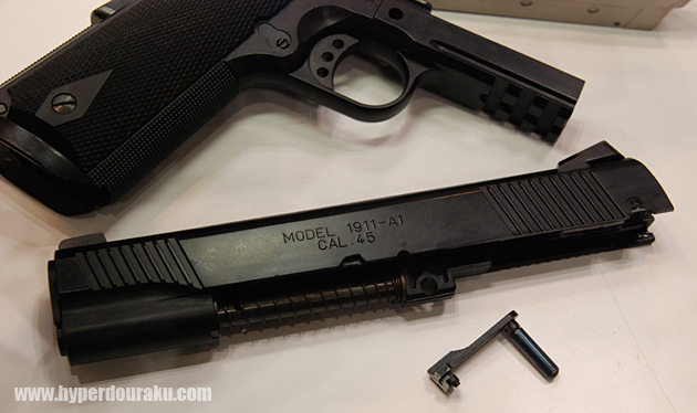 フィールドストリッピングはモデルガン同様というか、ガスガン同様というか、スライドストップを抜いて簡単に行える。