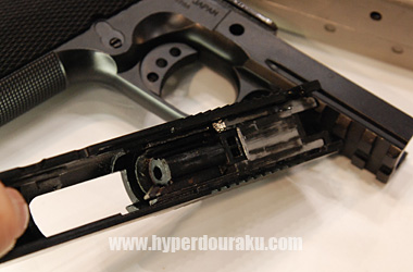 ガスブローバックということは普通はブリーチ内にシリンダーが納まる。にもかかわらず、ノズルの先がカートリッジの底面を叩くようになっている。なんだかスゴい構造だ。
