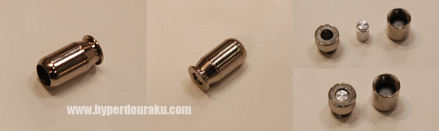 カートリッジは3ピース構造。軽量なアルミ製でメッキ加工されている。7mmキャップ火薬を使用する。
