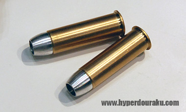 これがXカートリッジ。真鍮製かな。弾頭部分はアルミっぽい。Xってどういう意味だろう? 聞き忘れた。