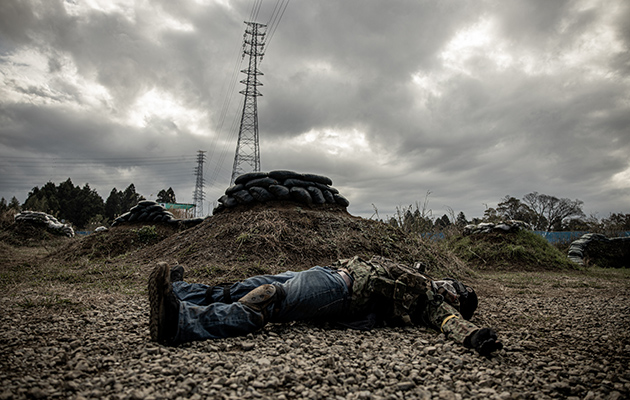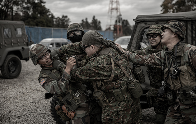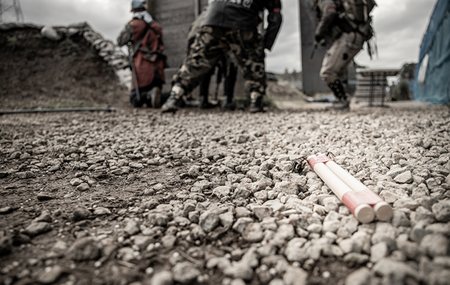 中には仲間の撤退の為に敵陣に突貫、瀕死の重傷を負うも、トドメを刺しに来た政府軍兵士へグレネードを使って敵と相打ちする人間ブービートラップと化した兵士もいた。 ※撤退戦の演出の為に設けられた特殊ルールを元にプレイしています。※画像中で飛んでいるゴーグルは、実際に目の保護をしている物とは別途の物となります。