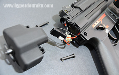 従来はフロントのフォアグリップを取り外してコネクターを接続する必要があったが、後部に平型ヒューズを配し、バッテリーコネクトすることができる様になった。