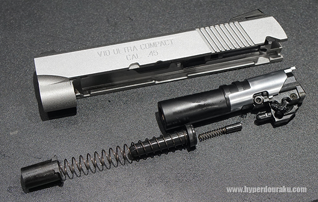 V10の特徴である10個のバレルポートが空いたアウターバレルは樹脂製2ピース構造。