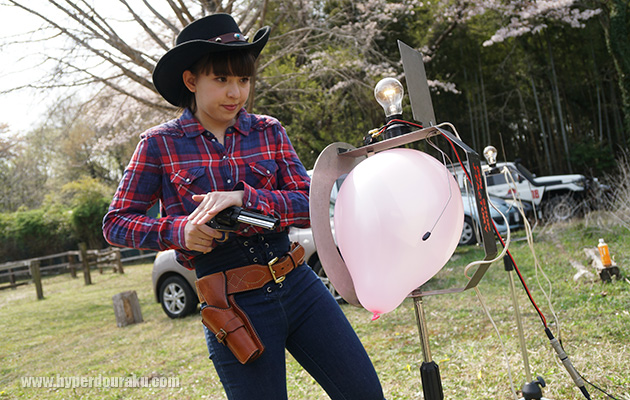 上の電球の点灯を合図に、モデルガンの火花を使用して風船を割るとドローのタイムが計測される。
