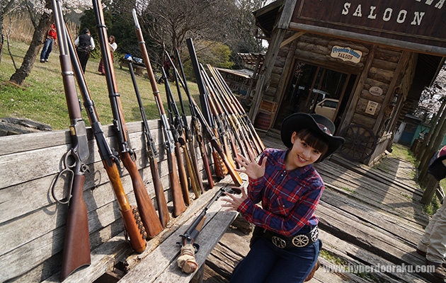 参加者のライフルがベンチにズラッと並べられる。西部劇ごっこお馴染みの展開。こうやって皆さんの貴重なコレクションを見ることができるのも楽しみのひとつ。この日はタレントのあいしす改め、滝澤いしすさんがゲストで参加!