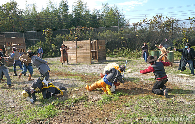 午前中は西部劇ごっこサバゲー。モデルガンとエアガンが入り乱れての戦いだ。弾の出ないモデルガンでも当たった雰囲気でみんなド派手に倒れてくれるぞ!! むしろいかにカッコよく倒れるかが、西部劇ごっこの醍醐味なのだ。