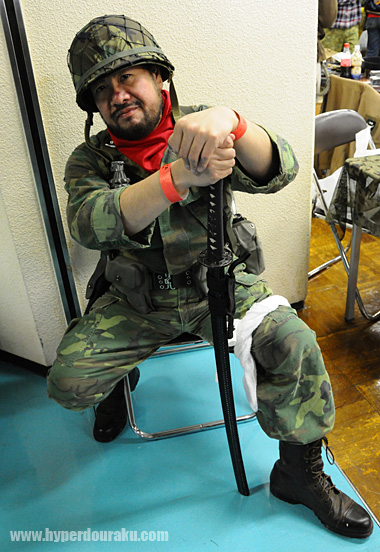 ジャケットはブラウンリーフ、パンツはグリーンリーフ、胸にはマークIIパイナップル手榴弾、赤いスカーフ、日本刀、その髭とか、もう再現度高すぎ。