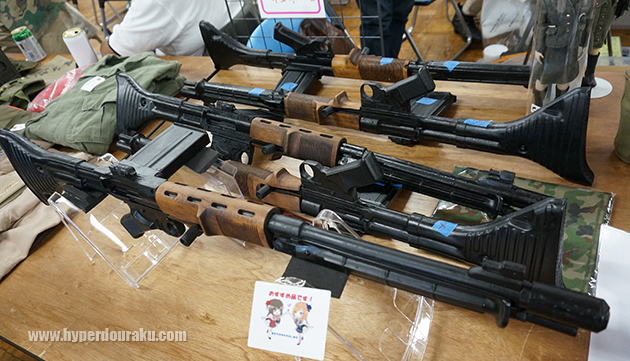 リエタクターズギアではショウエイとのコラボのFRP成形のなんちゃってFG42を展示。とても軽量でコスプレにはもってこい。