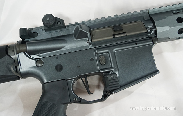外装はメタルレシーバーの電動ガンそのもの。グリップも電動ガン用のものが付くが、モーターは必要ないので中身は空。URX4のハンドガードやウルフグレーのカラーもこのまま発売されるそう。今回の展示品は残念ながら内部ユニットの入っていない外装のみだった。