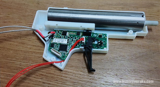 メカユニット中にはノズルの付いた大きな銀色のシリンダーと、その下に白いレールのようなパーツが付いている。本来ギアが収まる部分には電子基板のみがあり、マイクロスイッチ仕様のトリガーがあるのみ。