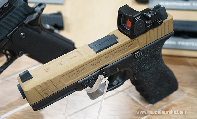 CQBグアムのブースでは、マルイのグロックベースのカスタムガン上矢十七式が販売。MRSが搭載できる肉抜きされたスライドが特徴。