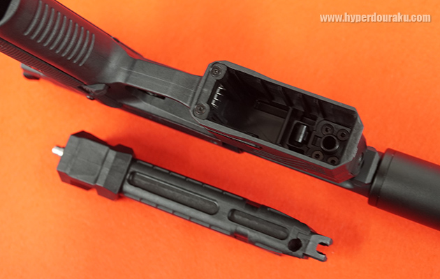 トリガー前のM4マガジンハウジングにはグリップ内マガジン前面まで給弾ルートがあり装填される仕組み。