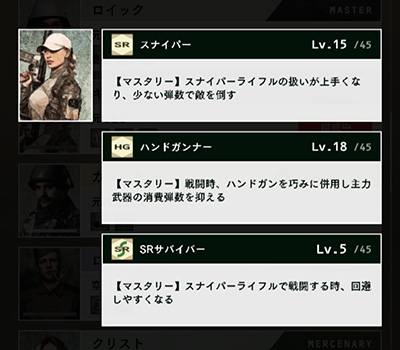 スナイパーには『スナイパー』が必須。狙撃は敵を倒しても弾薬を拾うことがないので、より少ない弾で効率的に敵を倒す必要がある。さらに『ハンドガンナー』を会得し主力武器の消費弾数を抑える。またスナイパーが死んでしまうと狙撃ができなくなるので、敵の攻撃を回避しやすい『SRサバイバー』も会得するとなおよいだろう。