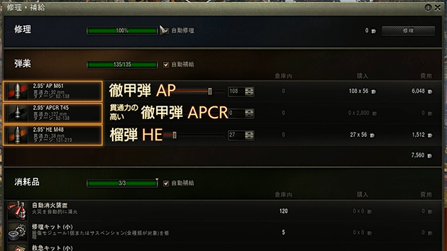砲弾の種類はいくつかあって、徹甲弾(AP)、榴弾(HE)が基本的な弾。さらに貫通力の高い硬芯徹甲弾(APCR)や、成形炸薬弾(HEAT)などの高価な弾もある。大雑把に言うと貫通させるのか、あるいは爆発によるダメージを負わせるのかの違いがある。