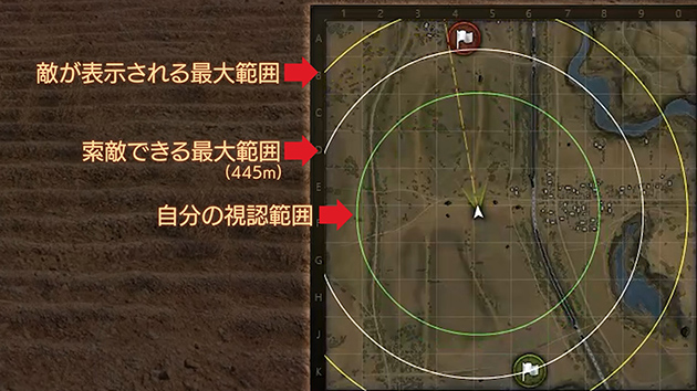 自分の視認範囲に敵が入ると敵を発見できる。味方が発見した敵も表示されるので常にミニマップを確認しながら、どの敵を狙うか考えよう。