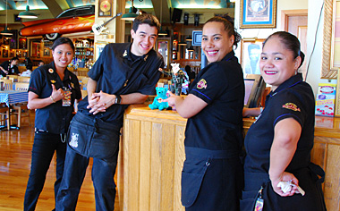 ホールスタッフと記念撮影。グアムのシューティング総評だが、今回3ヶ所のレンジを体験した感想では、やはり最も安心して射撃でき、190丁もの種類が豊富なのはワールドガンが一番だ。ありとあらゆる銃がそろっており、自分の撃ちたい銃を撃てる数少ない射撃施設だ。インストラクターもフレンドリーで自由に撃たせてくれる雰囲気がある。また、ワールドガンはちょっと価格はお高めだが、ホテル街から比較的近く、朝から半日でのオプショナルツアーとしては最適といえる。