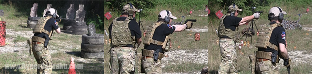 フランキ SPAS12。イタリアのルイジ・フランキ社が開発したコンバットショットガン。本来はポンプアクションと、セミオートマチックに切り替え可能だが、ポンプアクションのみでの射撃となった。一緒に撃ったレミントンM870と比べると、とにかくデカくて重い。